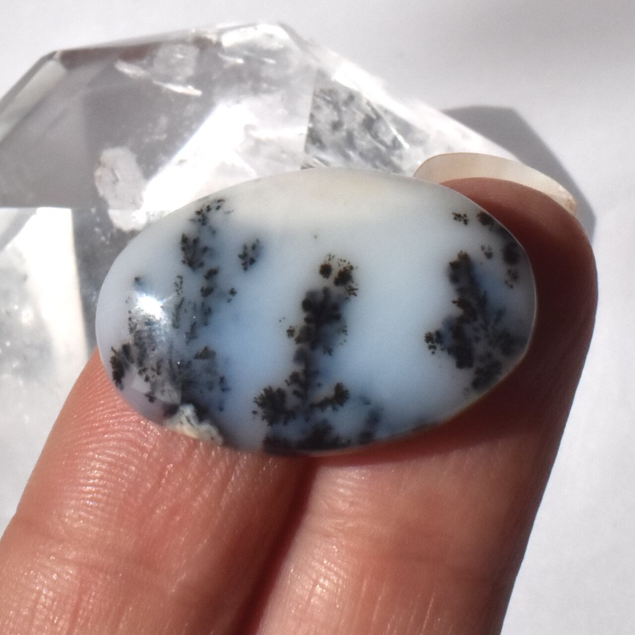 透き通るような白や淡いグレーの石の中に、黒い枝のような模様が広がっています。