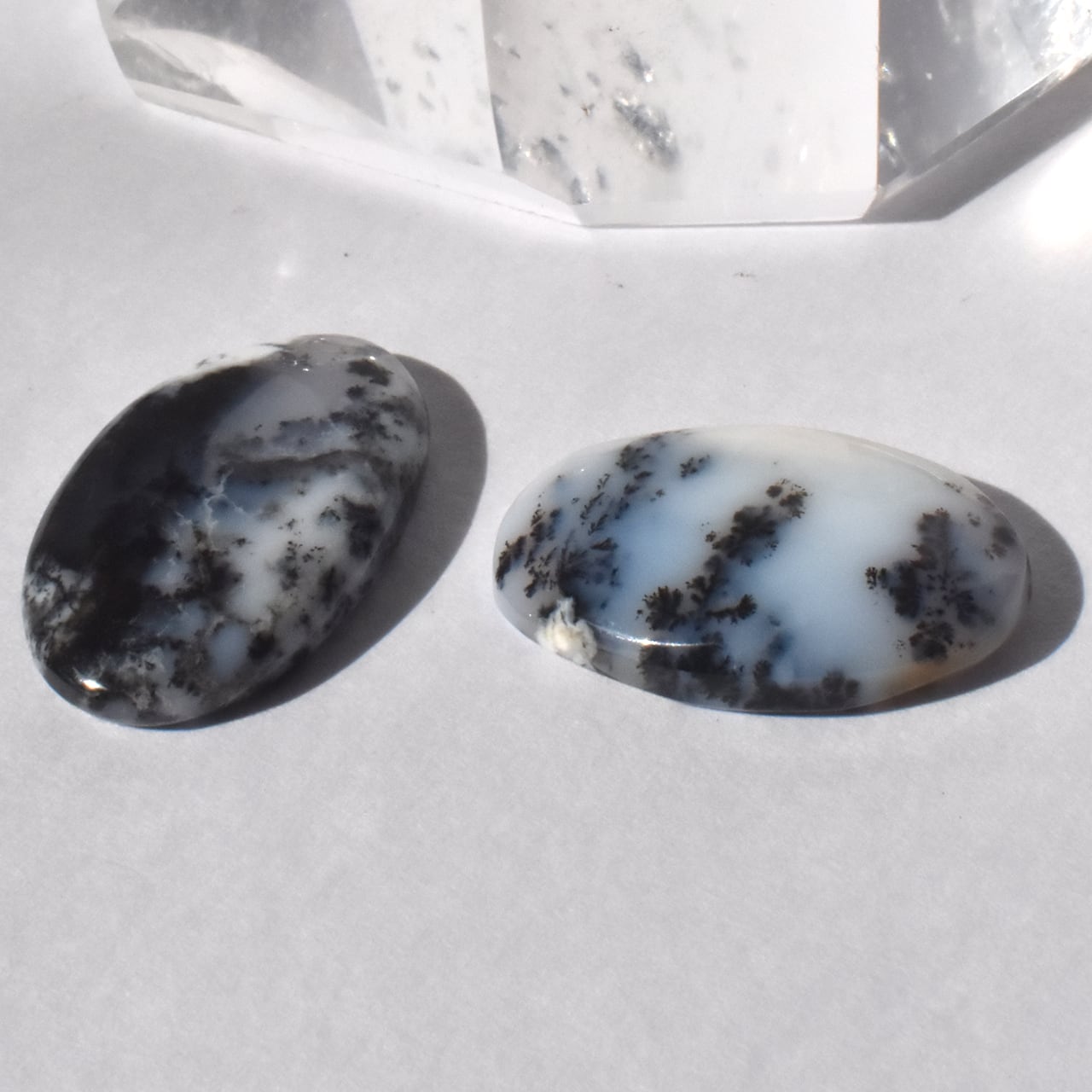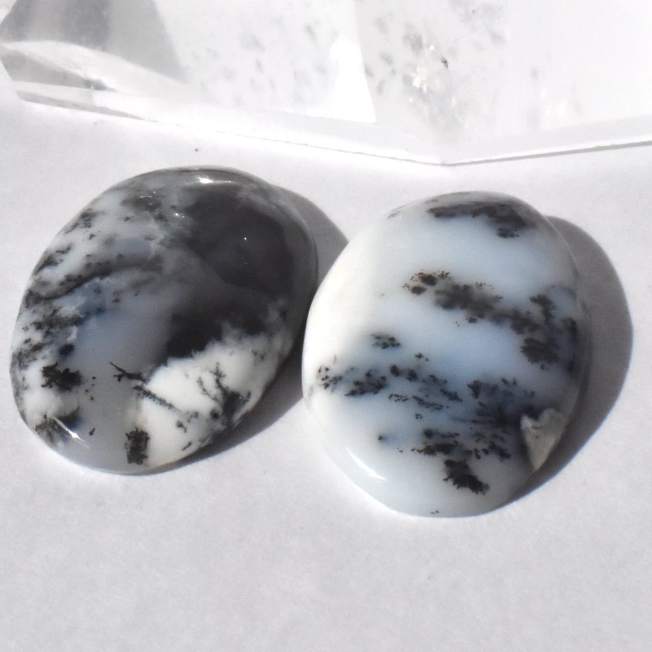 これらは、**天然のデンドリティッククォーツ(マーリナイト)**のカボションです。