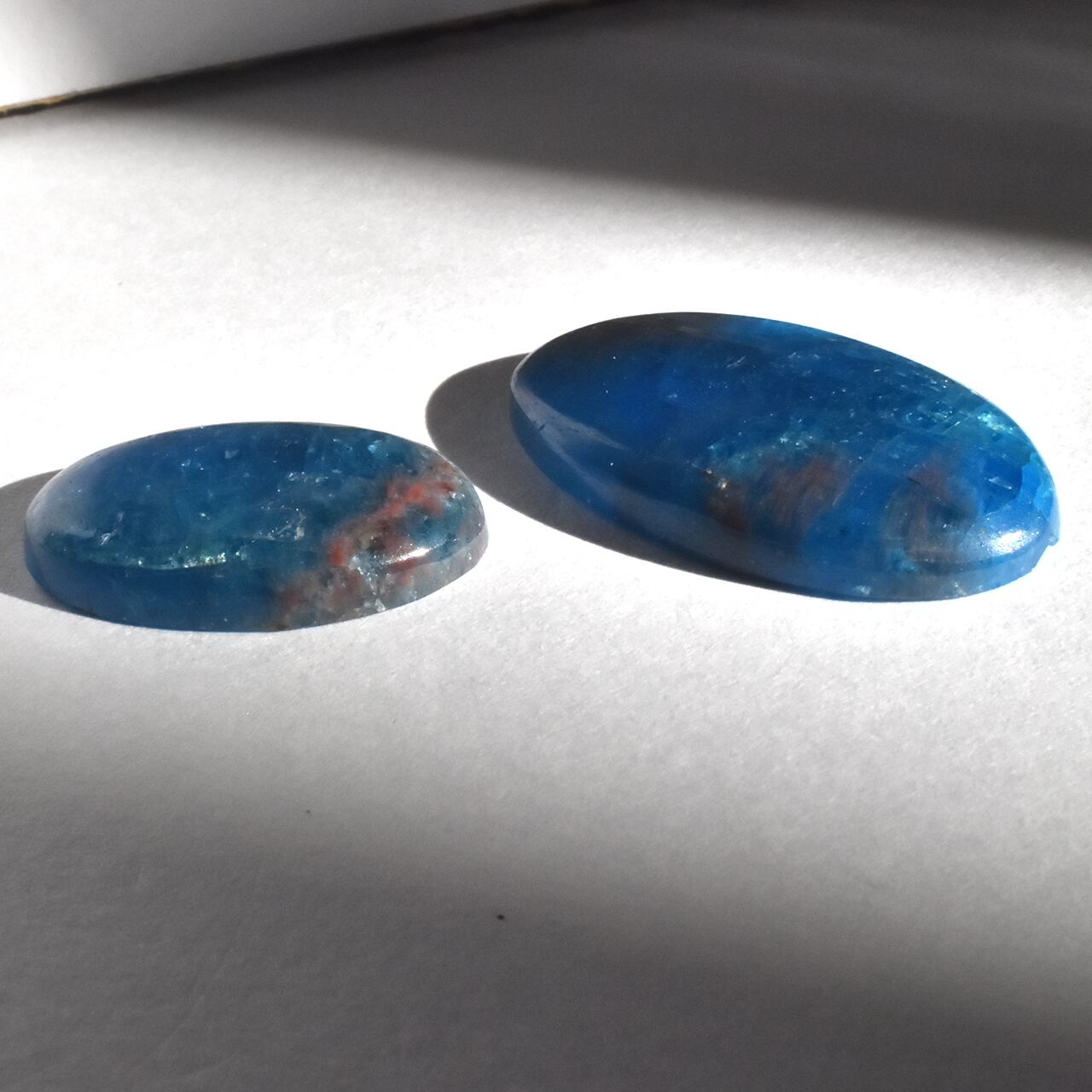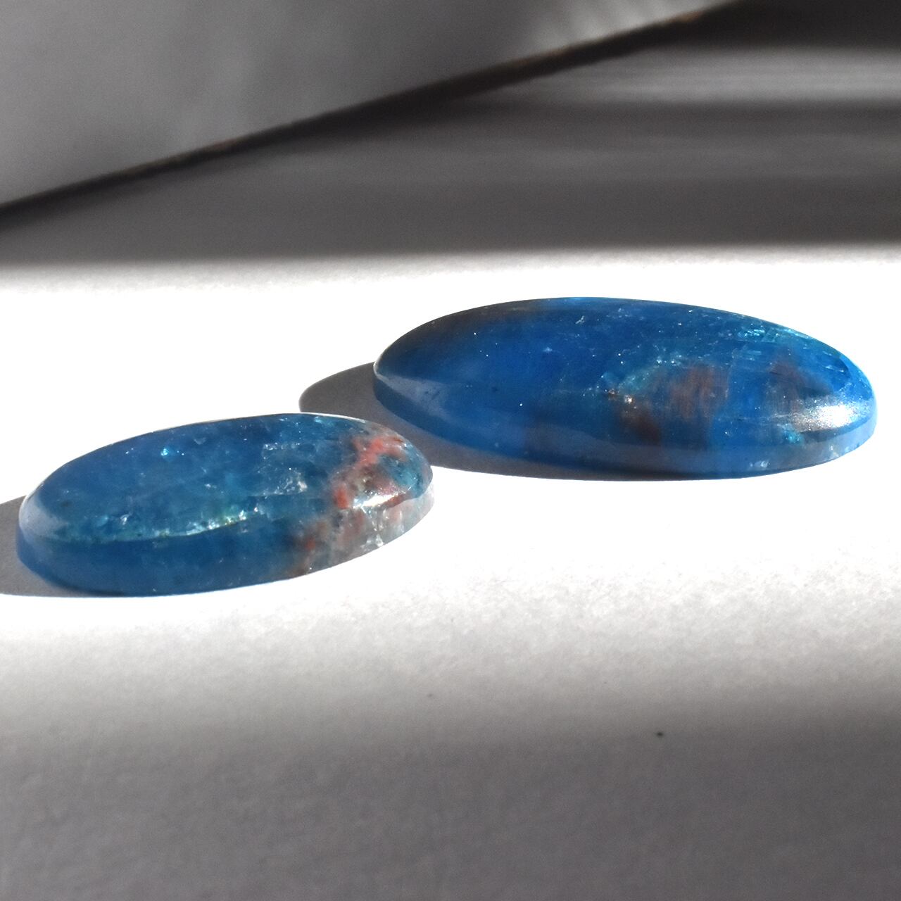 これらは、透き通るような青を宿す天然のブルーアパタイトのカボションです。