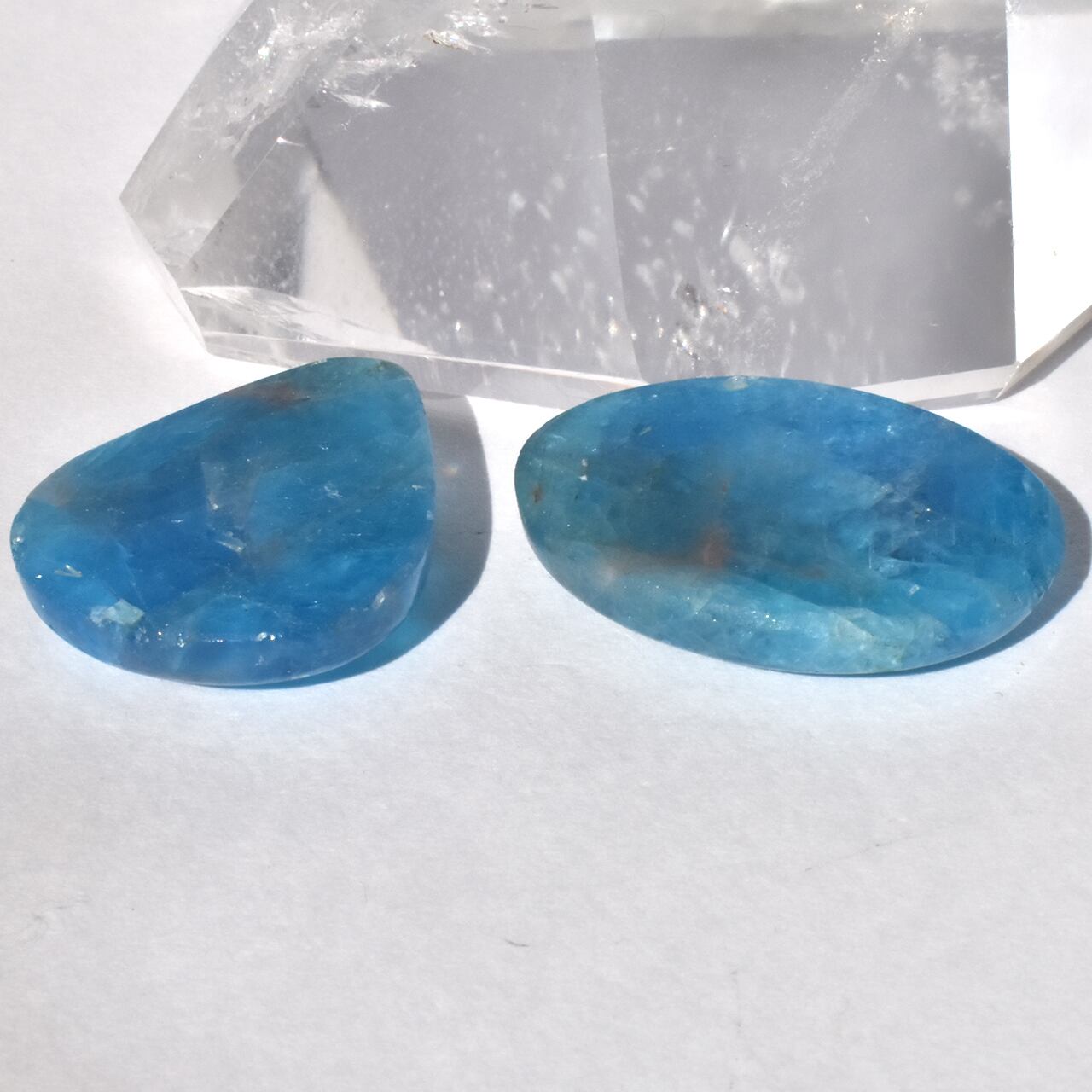 これらは、透き通るような青を宿す天然のブルーアパタイトのカボションです。