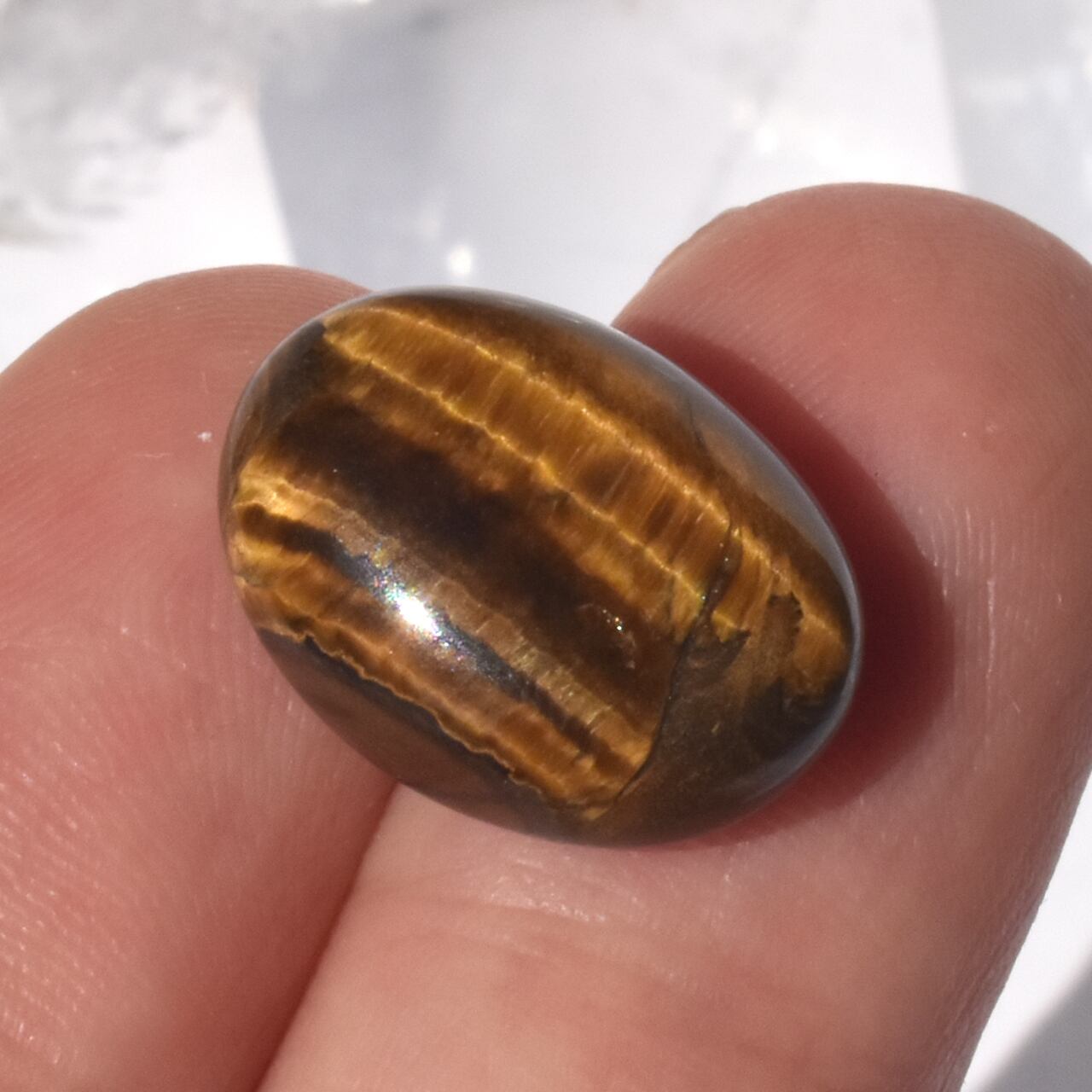 この美しい輝きは、石英の中に交互に重なったクロシドライト(青石綿)が