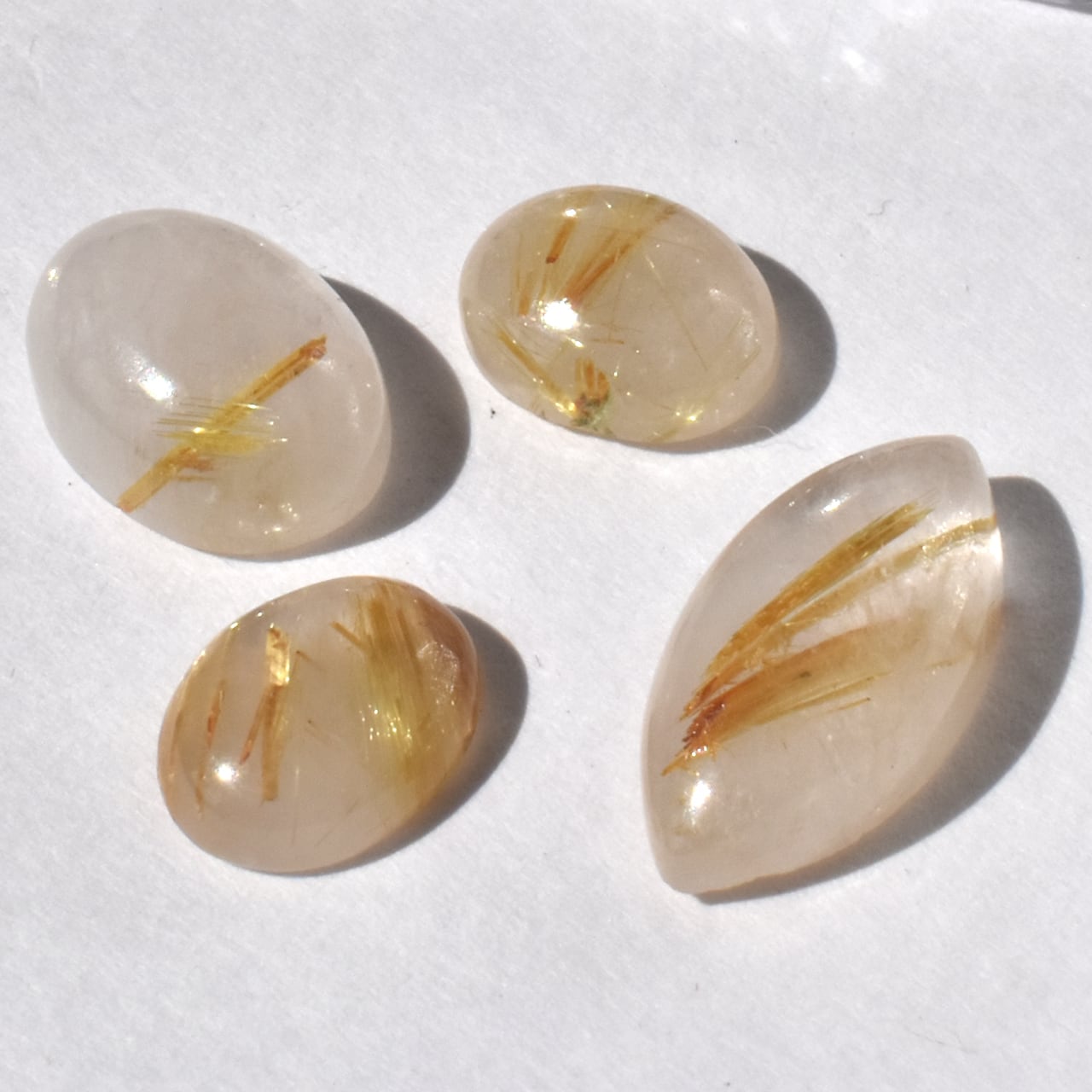 これらは、**天然のルチルクォーツ(水晶の中に金色の針状結晶を抱く石)**です。