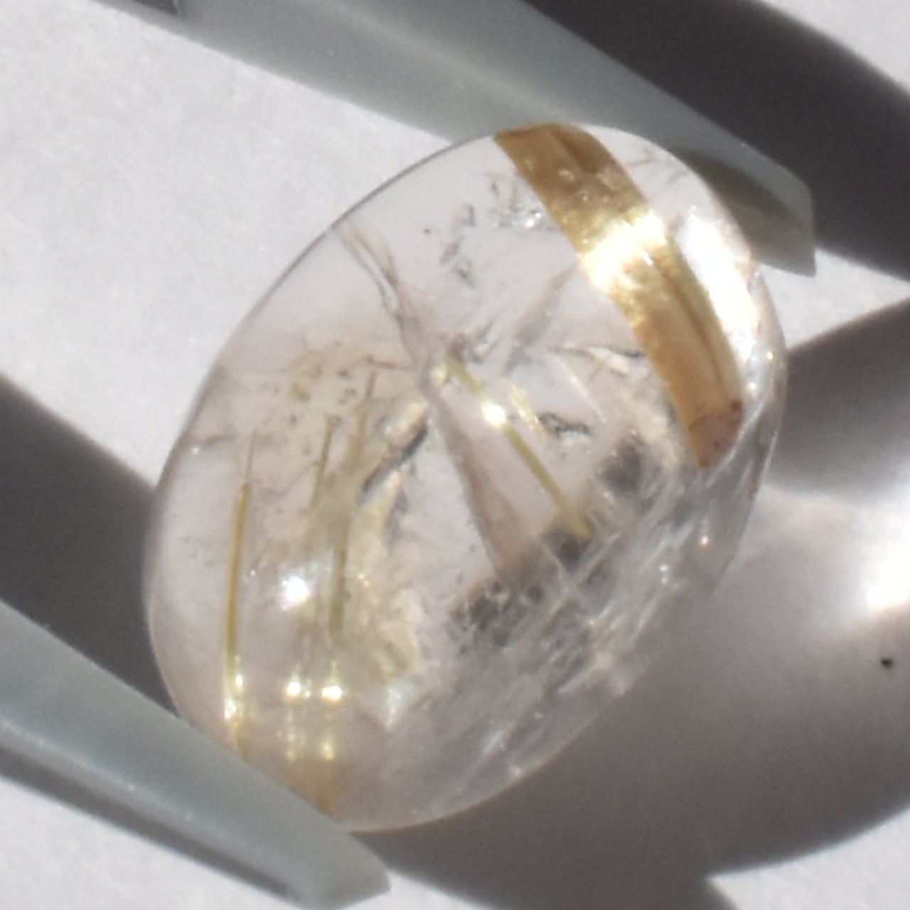 透明な水晶の中に、金の糸のようなルチルが静かに輝き、