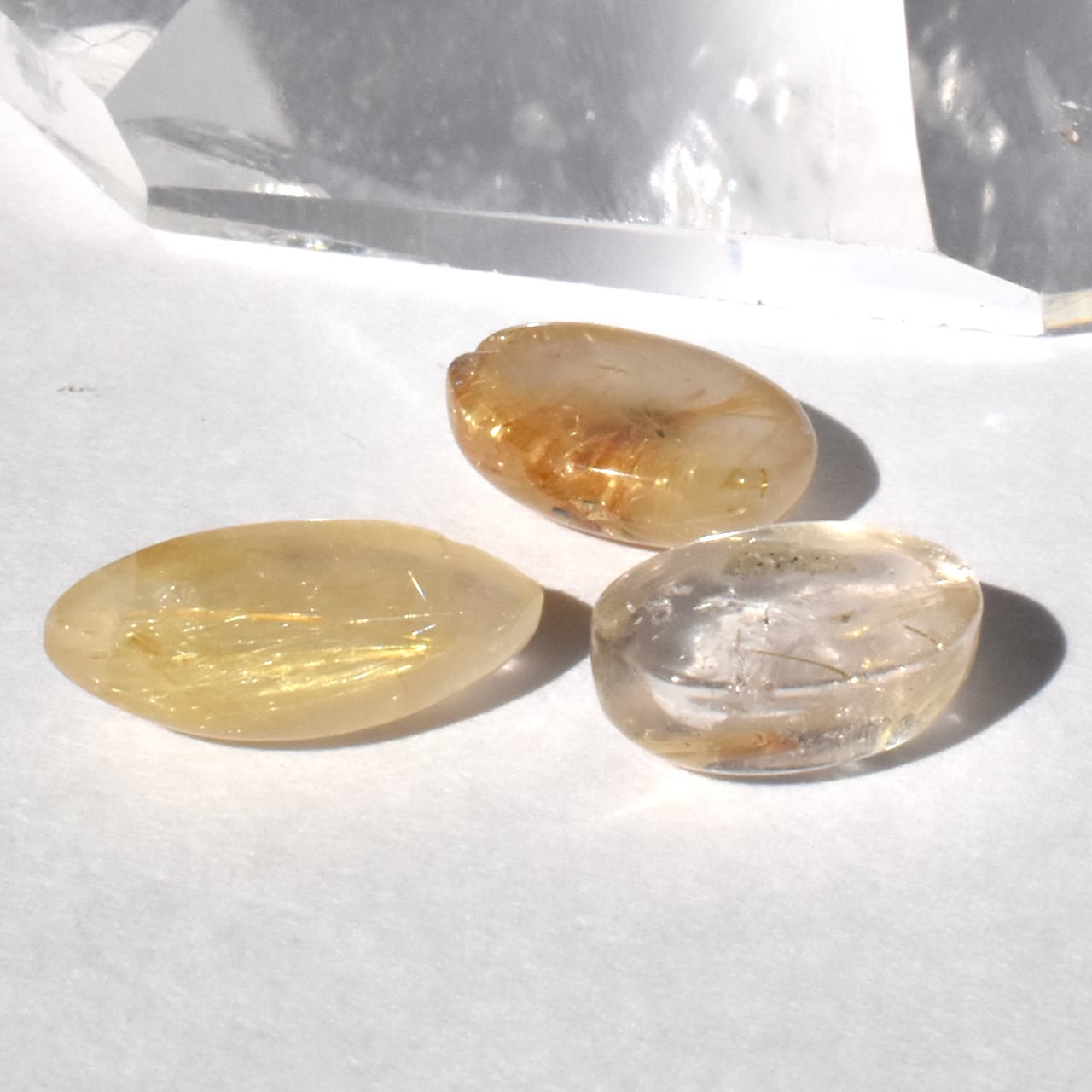 これらは、**天然のルチルクォーツ(水晶の中に金色の針状結晶を抱く石)**です。