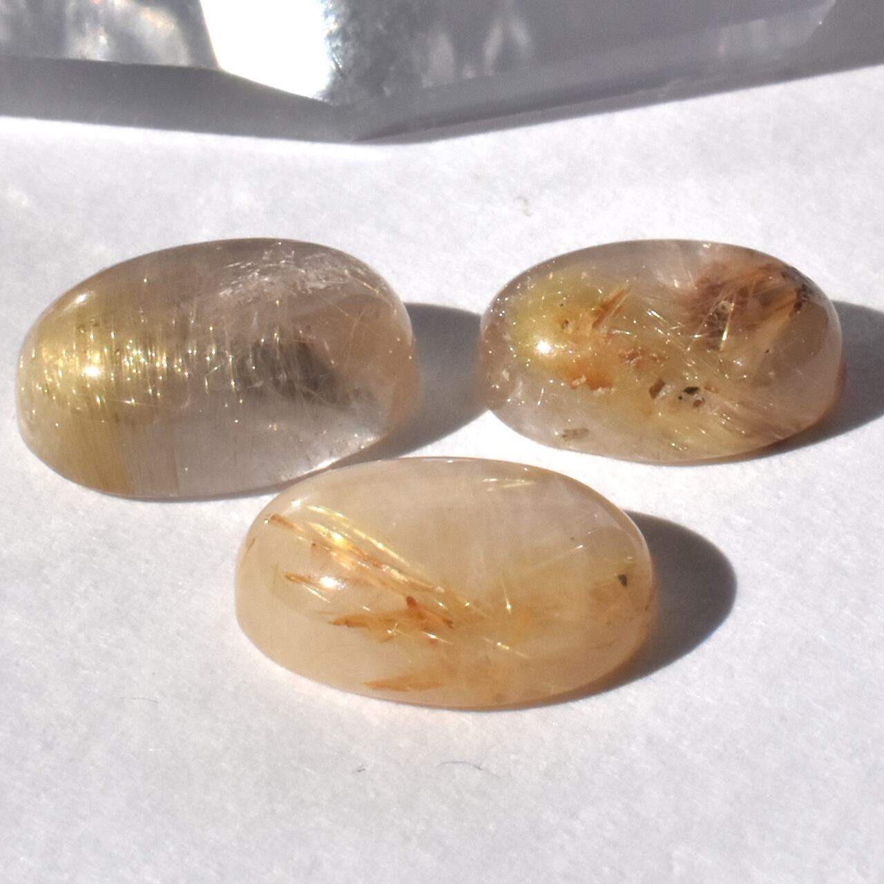 これらは、**天然のルチルクォーツ(水晶の中に金色の針状結晶を抱く石)**です。